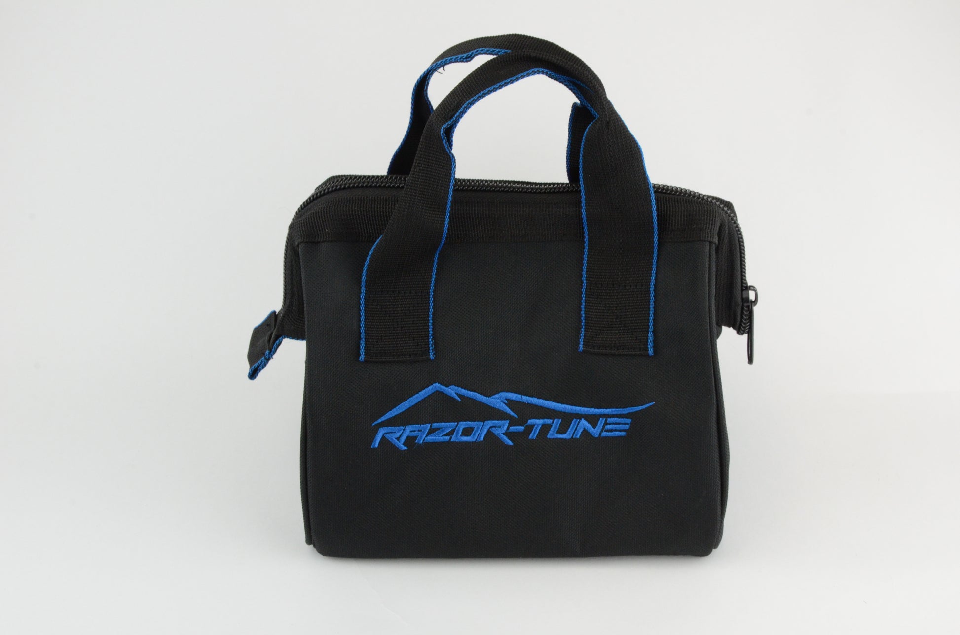 The Custom Razor-Tune Tool bag holds the tool, power supply, and accessories. Side pockets for safe storage of wheels and angle plates.